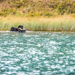 Nach einem kurzen ‘Walk-up’ für die ersten paar Hunde ging’s dann auch gleich an’s Wasser, wo es einen ‘Drive’ gab. Julia war ‘steady’ und nach einem ersten ‘Wasserretrieve’ sollte man den Hund über’s Wasser auf die andere Seite auf ein ‘Blind’ schicken. Julia hat es gemacht und da auch Claudia mit Duchess ihre Aufgabe gelöst hat, waren wir dann plötzlich nicht mehr so die Aussenseiter und konnten schlussendlich ganz gut mit den Labradoren mithalten. ;o) Wir bekamen auch immer mal wieder ein Kompliment von den anderen Teilnehmern. Mit wirklich sehr anspruchsvollen ‘Field Trial’ Situationen ging es dann weiter. Julia war gut ‘handlebar’ und es hat Spass gemacht mit ihr zu arbeiten.