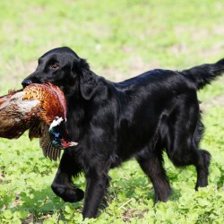Dann gab es den ersten ‘Retrieve’ für uns. Eine ziemlich weite ‘Markierung’ über ein Feld mit gemüseartigem Bewuchs, wo sich zuvor überall Rebhühner und Fasane versteckten. Ich glaube Julia hatte die ‘Markierung’ verpasst, weil sie zum anderen Schützten schaute als sie fiel und Norman fragte, ob ich sie so weit nach vorne kriege? Ich zuckte die Schultern, schmunzelte und antwortete, “we can see what happen’s!” ;o) Norman meinte, “okay – impress me!” Ich schickte Julia und sie hatte eine gute Linie, war ein wenig zu weit rechts, so dass ich sie auf Höhe des Rebhuhns stoppte; von da bekam sie auch schon Wind, spürte das Rebhuhn sehr schön auf und brachte es mit einwandfreier Abgabe zurück. Cool – die anderen Teilnehmer in der ‘Line’ klatschten sogar! ;o) Der zweite ‘Retrieve’ war dann ganz am Schluss des Tages eine ‘Makierung’ die sie dann punktgenau hatte, ebenfalls ein Rebhuhn und wieder mit perfektem ‘Delivery’.