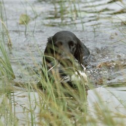 Zu Beginn hat sie mich etwas über Julia’s Ausbildungsstand ausgefragt und danach haben wir mit ein paar Markierungen und Memories begonnen zu trainieren; zusammen mit Anna, die einen Labrador von Birgitta’s Kennel führte (www.meadowlark.nu). Birgitta versuchte mit Verleitungen unsere “Schwachstelle” zu finden, um da mit dem Training anzusetzen. Es ging eine Weile den Julia löste die Aufgaben ganz gut – auch wenn sie von der Reise noch etwas müde war. Sie ermahnte uns dann an die Basics (‘Heelwork’, Stopp-Pfiff, Stimmvariation beim Schicken,…), zeigte uns einige Methoden und gab uns viele Tipps. Sie erzählte uns auch, auf was sie bei den jungen Hunden achtet und wie sie die verschiedenen Komponenten aufbaut. Das ausdauernde, selbständige Suchen der Hunde ist ihr sehr wichtig, kombiniert mit guter Führigkeit.